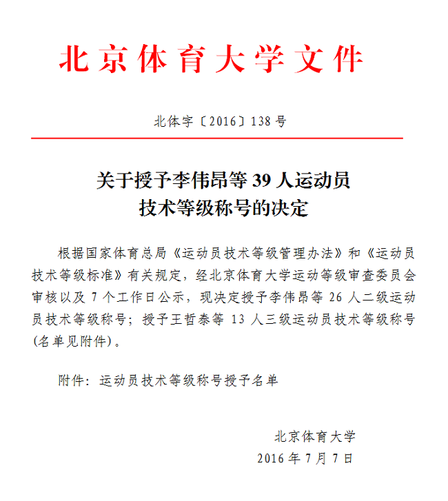 关于授予李伟昂等39人运动员技术等级称号的决定